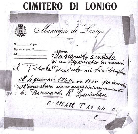 Un documento, custodito nell’archivio storico del comune di Lonigo, riportava questa importante descrizione: “CIMITERO DI LONIGO, In seguito a caduta di un apparecchio da caccia, il pilota è deceduto in via Cenghia il 4 gennaio 1945, ore 13:45, per incendio dell’aereo stesso, unico segno di riconoscimento era: Bernard F. Quinlan, O-825492 T 43 44”. [7]